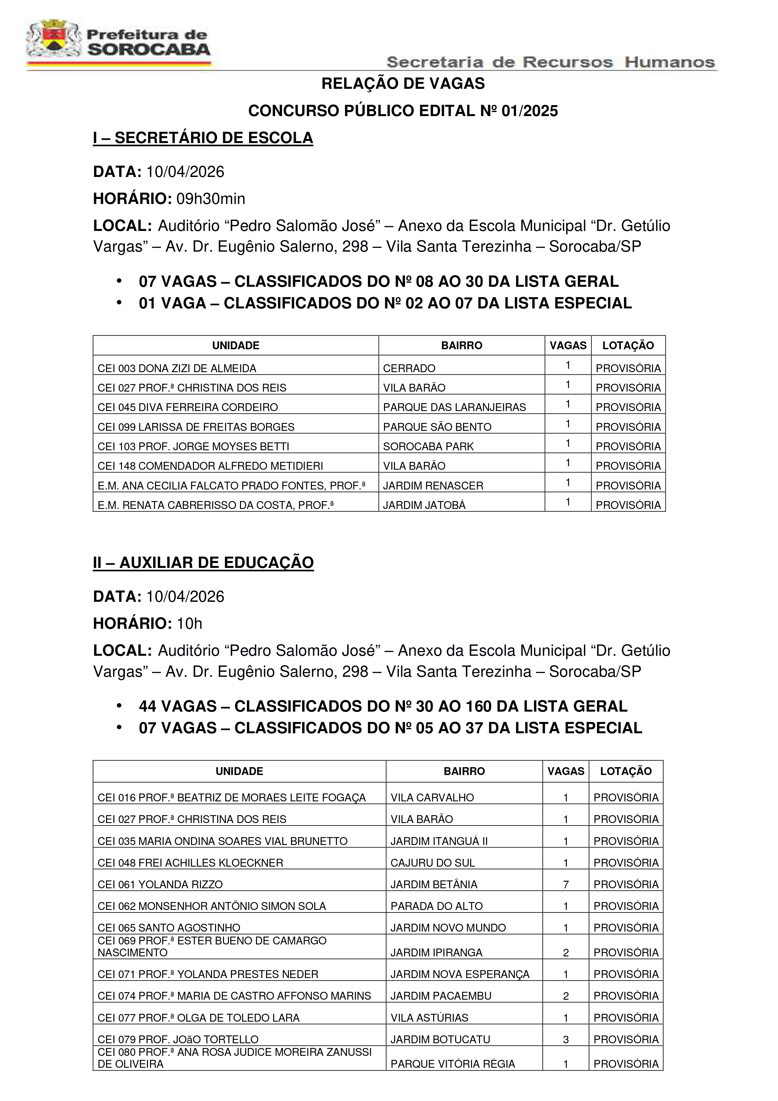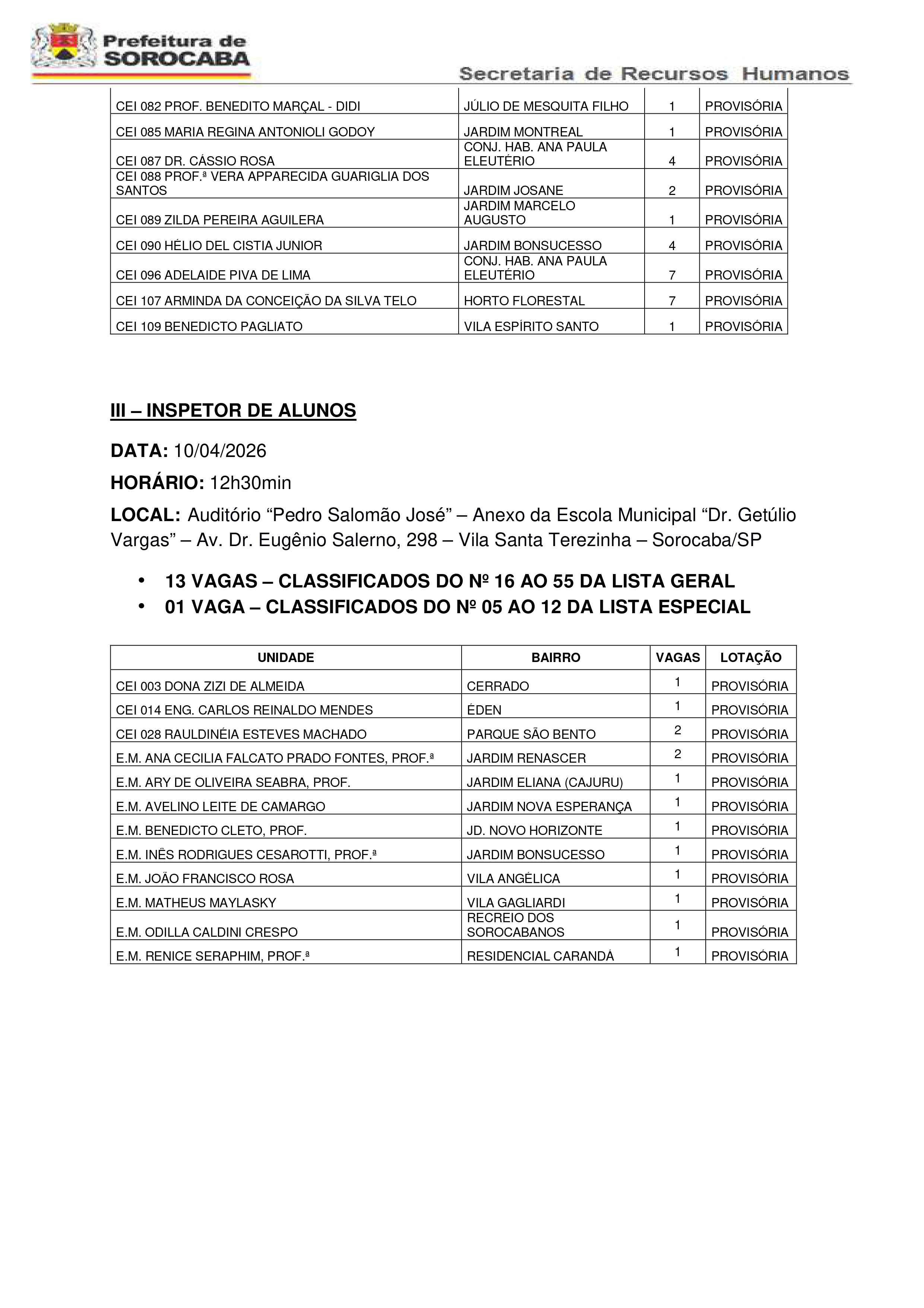 Vagas Disponíveis para Atribuição ___________________________________________________________________________________________________________________________________ ___________________________________________________________________________________________________________________________________ ___________________________________________________________________________________________________________________________________ ___________________________________________________________________________________________________________________________________ Atribuição de Classes/Turmas e Aulas – PEB I – CLT – RELAÇÃO DE VAGAS ATUALIZADA EM 29/01/2026 Classificados no Processo Seletivo Simplificado Edital SEDU/SERH n.º 01/2025 – 30/01/2026 Relação de Vagas – ATUALIZADA EM 29/01/2026 Atribuição de Classes/Turmas e Aulas – PEB I – CLT Classificados no Processo Seletivo Simplificado Edital SEDU/SERH n.º 01/2025 – 30/01/2026 Relação de Vagas – PEB I – Edital SEDU-SERH n.º 01/2025 – 30/01/2026 I – SUPERVISOR DE ENSINO Data: 08/01/2024 Horário: 09h00 Local: AUDITÓRIO DO CENTRO DE REFERÊNCIA EM EDUCAÇÃO R. ARTUR CALDINI, 211 – JARDIM SAIRA, SOROCABA – SP 01 VAGA II – ORIENTADOR PEDAGÓGICO Data: 08/01/2024 Horário: 09h00 Local: AUDITÓRIO DO CENTRO DE REFERÊNCIA EM EDUCAÇÃO R. ARTUR CALDINI, 211 – JARDIM SAIRA, SOROCABA – SP 02 VAGAS UNIDADE ESCOLAR BAIRRO VAGAS E.M. BENEDICTO CLETO, PROF. JARDIM NOVO HORIZONTE 01 VAGA FIXA E.M. DULJARA FERNANDES DE OLIVEIRA JARDIM SANTO AMARO 01 VAGA PROVISÓRIA INSPETOR DE ALUNOS Data: 08/01/2024 Horário: 14h00 Local: AUDITÓRIO DO CENTRO DE REFERÊNCIA EM EDUCAÇÃO R. ARTUR CALDINI, 211 – JARDIM SAIRA, SOROCABA – SP 05 VAGAS UNIDADE ESCOLAR BAIRRO VAGAS E.M. ANA CECILIA FALCATO PRADO FONTES, PROF.ª JARDIM RENASCER 03 VAGAS FIXAS E.M. JOÃO BATISTA LARIZZATTI JUNIOR ALTOS DO IPANEMA 02 VAGAS FIXAS AUXILIAR DE EDUCAÇÃO Data: 08/01/2024 Horário: 14h30min Local: AUDITÓRIO DO CENTRO DE REFERÊNCIA EM EDUCAÇÃO R. ARTUR CALDINI, 211 – JARDIM SAIRA, SOROCABA – SP 40 (QUARENTA) VAGAS, SENDO 33 (TRINTA E TRÊS) VAGAS FIXAS E 07 (SETE) VAGAS PROVISÓRIAS. UNIDADE ESCOLAR BAIRRO VAGAS CEI 048 FREI ACHILLES KLOECKNER CAJURU DO SUL 01 VAGA FIXA CEI 058 PROFª DULCE PUPPO DE OLIVEIRA PINHEIRO JARDIM MARIA DO CARMO 02 VAGAS PROVISÓRIAS CEI 061 YOLANDA RIZZO JARDIM BETÂNIA 02 VAGAS FIXAS CEI 065 SANTO AGOSTINHO JARDIM NOVO MUNDO 02 VAGAS PROVISÓRIAS Table DataCEI 077 PROFª OLGA DE TOLEDO LARA VILA ASTÚRIAS 01 VAGA PROVISÓRIA CEI 080 PROFª ANA ROSA JUDICE MOREIRA ZANUSSI DE OLIVEIRA PARQUE VITÓRIA RÉGIA 05 VAGAS FIXAS CEI 081 PROFª EDITH DEL CISTIA SANTOS PARQUE SÃO BENTO 04 VAGAS FIXAS CEI 085 MARIA REGINA ANTONIOLI GODOY JARDIM MONTREAL 01 VAGA PROVISÓRIA CEI 087 DR. CÁSSIO ROSA CONJ. HAB. ANA PAULA ELEUTÉRIO 10 VAGAS FIXAS CEI 096 ADELAIDE PIVA DE LIMA CONJ. HAB. ANA PAULA ELEUTÉRIO 11 VAGAS FIXAS CEI 101 LEONILDA CRUZ MALDONADO VILA FORMOSA 01 VAGA PROVISÓRIA SECRETÁRIO DE ESCOLA Data: 08/01/2024 Horário: 13h30min Local: AUDITÓRIO DO CENTRO DE REFERÊNCIA EM EDUCAÇÃO 03 VAGAS SENDO 02 VAGAS FIXAS E 01 VAGA PROVISÓRIA UNIDADE ESCOLAR BAIRRO VAGAS E.M. BENEDICTO CLETO, PROF. JARDIM NOVO HORIZONTE 01 VAGA FIXA E.M. JOÃO BATISTA LARIZZATTI JUNIOR ALTOS DO IPANEMA 01 VAGA FIXA E.M. MARIA DE LOURDES AYRES DE MORAES, PROF.ª JARDIM SANTA MARINA 01 VAGA PROVISÓRIA I – SUPERVISOR DE ENSINO Data: 29/06/2023 Horário: 09:00 Local: TEATRO MUNICIPAL TEOTONIO VILELA – Av. Eng. Carlos Reinaldo Mendes, s/n – Alto da Boa Vista, Sorocaba – SP 01 VAGA II – DIRETOR DE ESCOLA Data: 29/06/2023 Horário: 09:00 Local: TEATRO MUNICIPAL TEOTONIO VILELA – Av. Eng. Carlos Reinaldo Mendes, s/n – Alto da Boa Vista, Sorocaba – SP 02 VAGAS DE LOTAÇÃO PROVISÓRIA UNIDADE ESCOLAR BAIRRO TIPO LOTAÇÃO CEI-069 ESTER BUENO DE CAMARGO NASCIMENTO, PROFª Jardim Ipiranga (Lilú) PROVISÓRIA E.M. LEDA THEREZINHA BORGHESI RODRIGUES Ipanema Ville PROVISÓRIA III – ORIENTADOR PEDAGÓGICO Data: 29/06/2023 Horário: 09:00 Local: TEATRO MUNICIPAL TEOTONIO VILELA – Av. Eng. Carlos Reinaldo Mendes, s/n – Alto da Boa Vista, Sorocaba – SP 02 VAGAS DE LOTAÇÃO PROVISÓRIA UNIDADE ESCOLAR BAIRRO TIPO LOTAÇÃO EM. “Amin Cassar, Prof.” Jardim São Camilo PROVISÓRIA CEI 83 “Maria Carmem Rodrigues Saker” Jardim Lena (Éden) PROVISÓRIA ATRIBUIÇÃO DE CLASSES/TURMAS E AULAS – PEB I CLASSIFICADOS NO CONCURSO PÚBLICO EDITAL Nº 01/2020 Data: 29/06/2023 Horário: 10h00min Local: Teatro Municipal Teotonio Vilela – Av. Eng. Carlos Reinaldo Mendes, s/n – Alto da Boa Vista, Sorocaba – SP Nº ORDEM UNIDADE ESCOLAR BAIRRO TIPO DE ENSINO PERÍODO TURMA HORÁRIOS DE HTP MOTIVO DA CLASSE VAGA 1 CEI 013 “ALUISIO DE ALMEIDA” BRIGADEIRO TOBIAS PARCIAL 190 MANHà PRÉ II B TER 17:15H ÀS 18:45H TER 07:05H ÀS 07:50H SEG 12:00H ÀS 13:30H APOSENTADORIA 2 CEI 023 “DOLORES CUPIAM DO AMARAL” JD DOS ESTADOS PARCIAL 200 TARDE CRECHE III QUA 11:15H ÀS 12:45H TER 12:00H ÀS 12:45H QUI 12:00H ÀS 12:45H SEG 11:15H ÀS 12:00H SEX 12:00H ÀS 12:45H APOSENTADORIA 3 CEI 073 “MATILDE GAVIN” VILA FORMOSA INTEGRAL TARDE CRECHE III C SEG 11:15H ÀS 12:45H TER 12:00H ÀS 12:45H QUA 12:00H ÀS 12:45H A DEFINIR APOSENTADORIA 4 CEI 111 “IVAN GERBOVIC” #N/DISP PARCIAL 190 MANHà PRÉ I A QUA 12:05H ÀS 12:50H QUI 12:05H ÀS 12:50H SEG 12:05H ÀS 12:50H TER 12:05H ÀS 12:50H SEX 12:05H ÀS 12:50H EXONERAÇÃO 5 E.M. “AVELINO LEITE DE CAMARGO” JARDIM NOVA ESPERANÇA FUNDAMENTAL MANHà 4º ANO A QUA 17:45H ÀS 19:15H TER 11:30H ÀS 12:15H TER 07:00H ÀS 07:45H QUI 10:40H ÀS 11:25H APOSENTADORIA 6 E.M. “BASÍLIO DA COSTA DAEMON, PROF.” PAINEIRAS FUNDAMENTAL TARDE 4º ANO C QUI 17:30H ÀS 19:00H QUA 17:30H ÀS 18:15H SEG 16:40H ÀS 17:25H QUA 15:00H ÀS 15:45H CRIAÇÃO 7 E.M. “IRINEU LEISTER, PROF.” JARDIM IPIRANGA FUNDAMENTAL MANHà 4º ANO C SEG 17:35H ÀS 19:05H TER 11:30H ÀS 12:15H A DEFINIR A